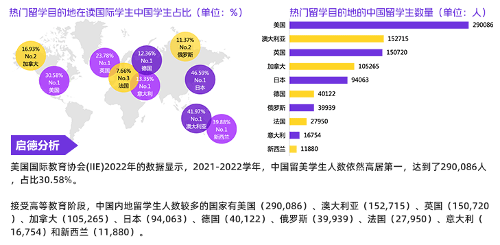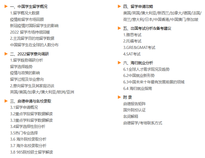 了解更多 >启德教育重磅发布《2022中国留学白皮书》,覆盖本科、硕士、博士三大留学阶段、重点学科百余专业的留学申请,结合市场调研与留学生访谈,汇集12个留学目的地官方数据,整合分析留学意向、院校申请、TOP院校录取分析,就业行业多维度数据,梳理出系统化的留学申请攻略与海内外就业移民指南。绘制中国学生留学状况全景图谱,为学子提供决策依据...