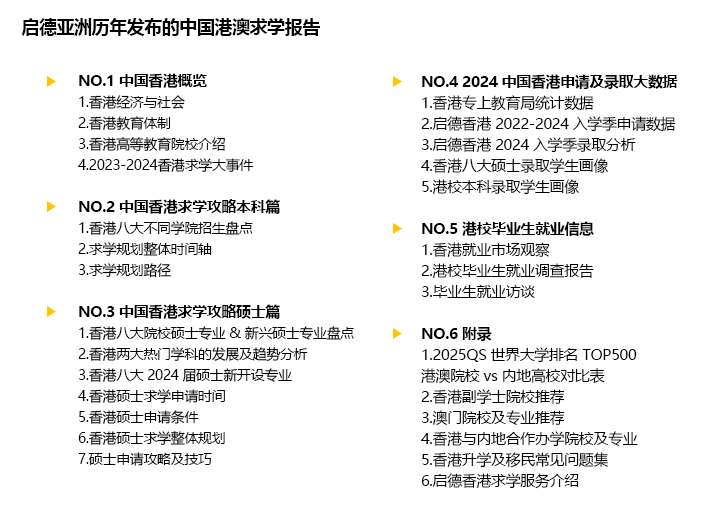 了解更多 >2020 年,我们在业内最早发布中国香港求学报告,并在之后的 5 年,聚焦不同维度,持续更新报告。2023 年,我们聚焦大湾区发展战略中的港澳高等教育发展政策,推出启德大湾区求学报告。2024年,报告撰写团队重新整装待发,基于24年入学季近7000个录取案例,进一步优化报告内容,将求学政策、教育制度、申请……