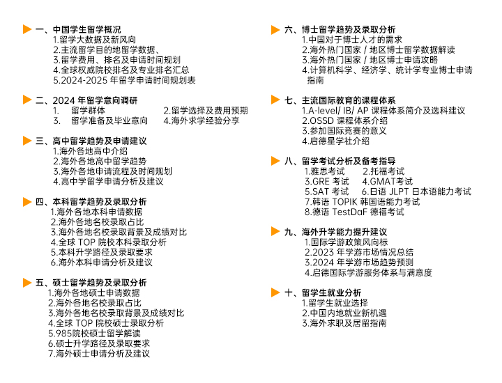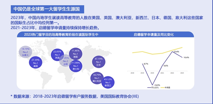 2024年1月,启德教育发布《中国留学市场2023年盘点与2024年展望》,以启德教育自有客户服务数据为基础,综合整理美、英、澳、加、亚洲、欧洲等中国学生主要留学目的地的各类官方数据,梳理出2023年中国留学市场概貌、以及各主流留学目的地发生的可能对中国留学生产生影响的大事件,并对2024年中国留学市场的发展变化进行了展望与预测。