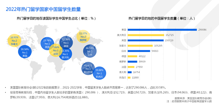 了解更多 >美国国际教育协会(IIE)数据显示,接受高等教育阶段,中国留学生人数最多的十个国家分别是美国(317,299)、澳大利亚(160,850)、英国(148,530)、日本(95,003)、加拿大(58,015)、俄罗斯(42,972)、德国(41,353)、法国(29,731)、意大利(15,649)和新西兰(14,065)。同时,各热门留学目的地在读国际学生中,中国学生占比均小幅上涨,且位列第一、二大生源国。