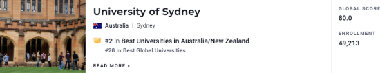 悉尼大学不仅历史悠久,拥有众多成就,其世界排名也凭借出色的学术能力非常靠前。悉尼大学在2022年U.S. News世界大学排名中,获得TOP28,全澳洲第二。