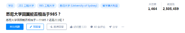 前不久知乎上有个帖子非常火,有同学提问:悉尼大学回国能等于985吗?这份帖子被浏览了超过250万之多。