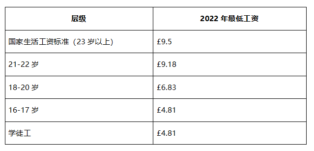 2022年4月,英国政府更新了最低工资标准。英国目前有两种工资标准,分别是国家最低工资标准(NMW)和国家生活工资标准(NLW)。最低工资标准因年龄而异,NLW高于NMW,适用于所有年满23岁的在职人员。具体如下表所示:
