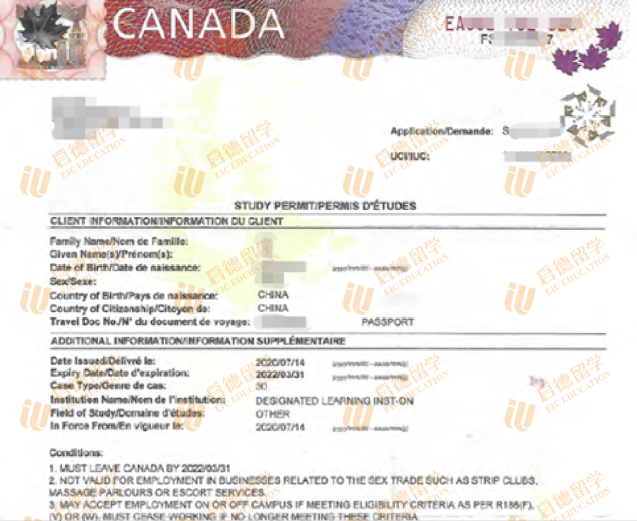 举个例子来解读一下这句话。在加拿大境外,比如说在中国,申请study permit,其实申请的是学生类别的签证。也就是说,在中国申请学习许可,最先拿到的并不是学习许可,而是贴在护照上的一张student类别的visa (人称“学生签证”)。看图~