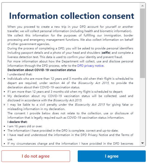 你可以在航班起飞前 7 天开始填写 DPD,并在出发前往澳大利亚前 72 小时内提交。这是因为你必须在航班起飞前 72 小时内提供您的健康信息和声明。