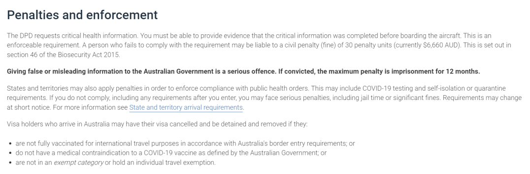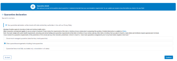 3. 声明你了解抵达澳大利亚和你登陆州或领地时适用的检疫和检测要求,以及不遵守规定的处罚。