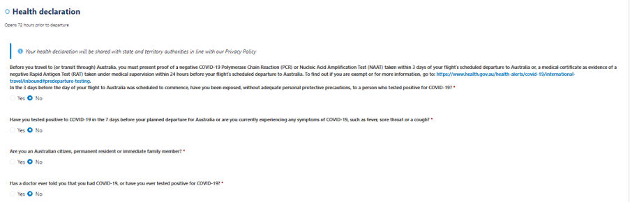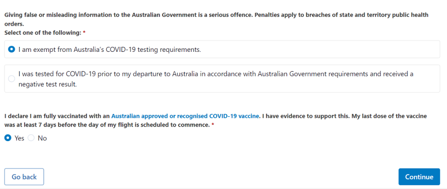 接下来,来到非常重要的一步,根据最新政策,入境前核酸检测取消,因此乘客仅选择 I am exempt from Australia’s COVID-19 testing requirements即可。