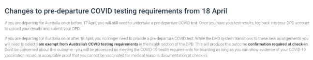 你需要在填写DPD时,在健康部分选择我被免除了澳大利亚的 COVID 测试要求。这将产生登记时所需的结果确认。不需要担心这一结果。只要你能出示你的 COVID-19 疫苗接种记录的证据或可接受的证据证明你因医疗原因无法接种疫苗,你将会被视为符合登机的 COVID-19 健康要求。根据《生物安全法》中的非紧急措施规定,进出澳大利亚的国际旅客仍需提供针对 COVID-19的双重疫苗接种证明。根据医疗建议,旅客在乘坐国际航班时仍需佩戴口罩。