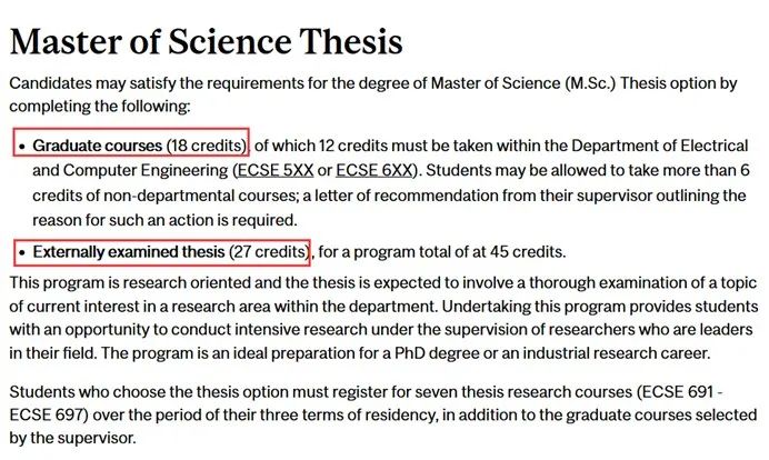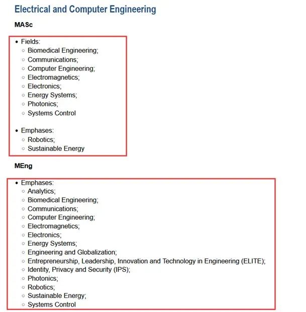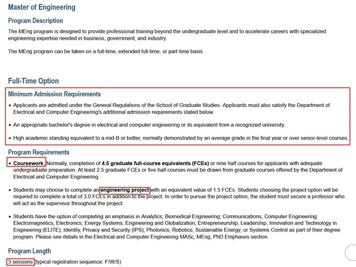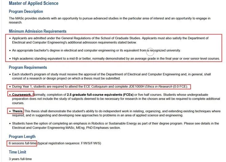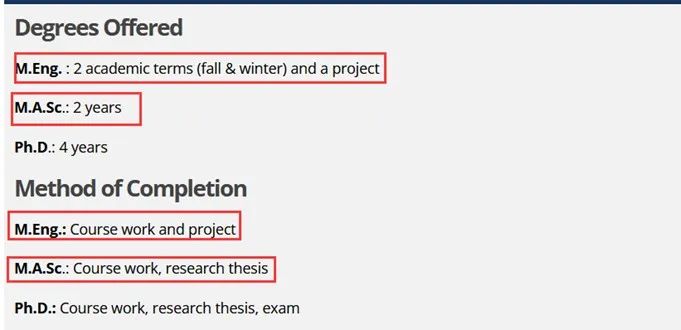 多大的ECE硕士隶属于The Edward S. Rogers Sr. Department of Electrical and Computer Engineering学院。分为授课型硕士(course-based)和研究型硕士(research-based)。 其中授课型将授予工程硕士学位Master of Engineering ,而研究型的将授予应用科学硕士学位Master of Applied Science。 多大的研究型硕士需要先期匹配导师并进行套磁,若有导师觉得你的科研能力和经历跟他的研究很匹配的情况下会主动跟学生安排面试,若面试通过后,可以直接拿到导师的offer,并在入学后加入导师的项目组,获得科研奖学金。这种研究型的硕士申请难度一般较大,特别是针对名校的申请,对套磁信和学生的硬性条件和软性背景要求均较高。因此在我们以往的申请中,多为申请授课型的硕士。 其实授课型和研究型两者研究领域相差不大,只是对于毕业条件的要求有所差距,具体对比如下: 从以上对比中可以看出,虽然官网列出的录取要求是一样的,但是研究型比授课型整整多出来一倍的学习时长即3个session,因此两者对于申请者的科研能力要求上还是有所差距的,所以针对一般的申请者,建议以申请授课型的MEng为主,以申请研究型的MASc为辅,以入围为主要目的,突围为锦上添花,这样才能确保更稳妥的结果。