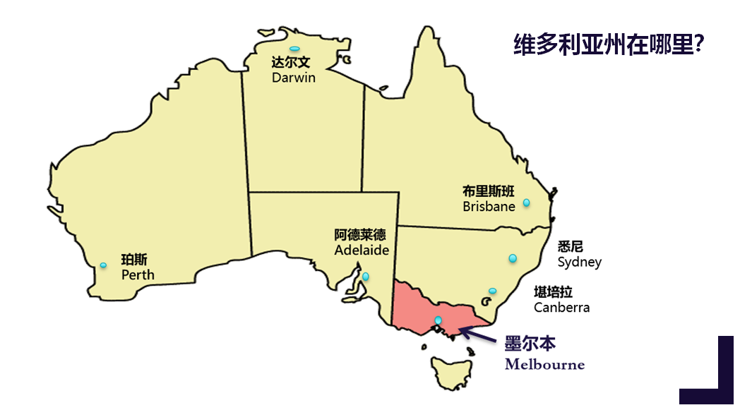 维州位于澳大利亚东南沿海,从地图上大家不难发现,维多利亚州其实是澳大利亚面积最小的一个大陆州,占地227,600平方公里,大约与中国浙江省和江苏省的总面积相当。维多利亚州的首府城市是声名卓著的墨尔本,其第二大城市是吉朗。