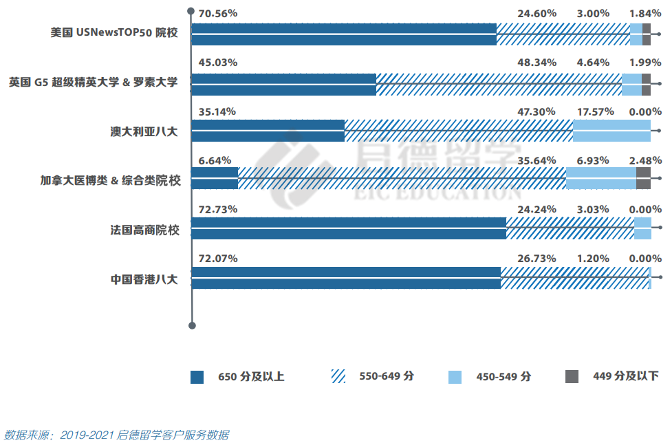各国热门院校硕士录取雅思成绩:雅思成绩高于“6-7分“占比在以上院校中占比均为最大,除了加拿大医博类&综合类院校占比为75.41%外,其余院校雅思录取占比均高于82%,且中国香港八大占比最高,为91.49%。硕士录取学生中五成以上托福成绩“94分及以上”,其中商科学生“94分及以上”占比最高。数据显示,美国USnews Top50院校的硕士录取中,托福成绩“94分以上”占比超过七成,为78.94%。GRE成绩“310分以上”美国 USNewsTOP50 院校占比超过八成,为 89.51%。 “GMAT650分以上”美国 USNewsTOP50院校、法国高商院校和中国香港八大占比均超过七成,分别 为 70.56%、72.73% 和72.07%。了解录取要求后,大家就可以针对性地提升自己的申请竞争力啦!祝大家早日申请到自己理想的院校!更多留学问题,可点击文末扫码预约老师详细咨询~