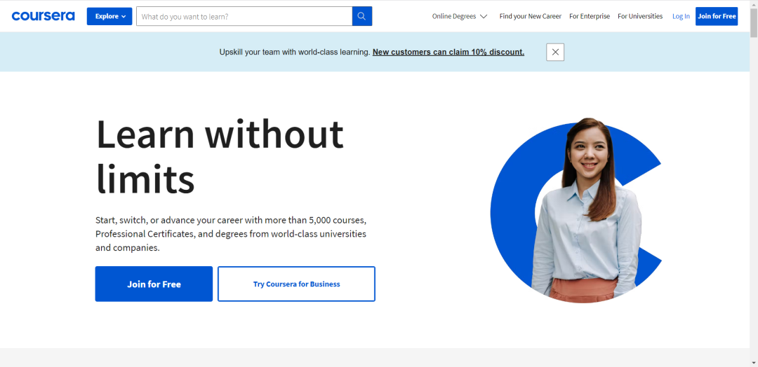 1. Coursera Coursera是国外一家著名的在线课程网站,上面包含了各种各样的课程,老师的讲解也非常的细致。 里面的课程有课后的习题,并且在结课的时候有相应的证书。 不过这个网站很多课程都需要付费。 大家也可以通过学校的邮箱注册,注册后会有一门课的免费上课机会,同学们可以选择网站上的任意一门课进行学习,但是其他后续的课程就都需要付费了。