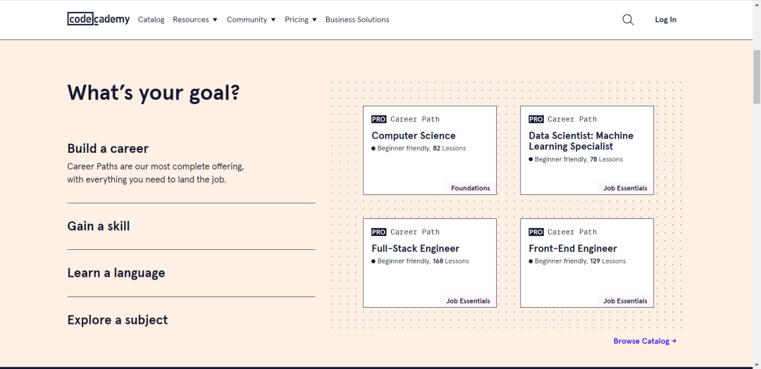 2. Codecademy 这是一个免费的编程学习网站,并且上面的内容比较的齐全。可以学习不同的计算机语言。 网站上把原本复杂的课程拆分成一个个小节,引导大家更容易的理解内容。 这个网站非常适合零基础的新手以及还在考虑是否想要更深入学习编程的同学。
