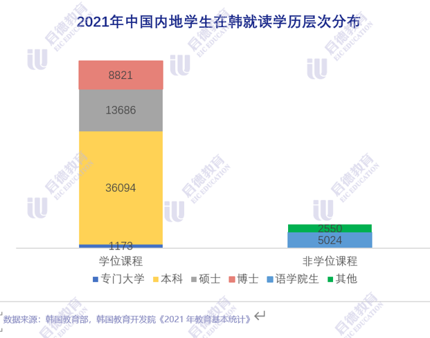 在赴韩留学的学生中就读本科阶段的学生占整体约53%,硕士阶段学生占比20%,去韩国留学的本科生是相对较多的。
