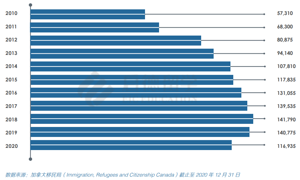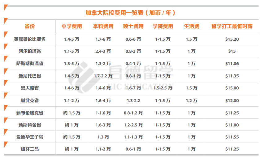 加拿大作为传统热门留学国家,一直备受中国内地学生欢迎。根据加拿大移民局(IRCC)公布的数据显示:2019年,共有14.1万中国内地学生在加拿大留学,超过加拿大所有国际学生的五分之一;2020年因为新冠疫情,人数有所下降,为 11.7万。从2010 年到2020 年的11年间,在加拿大学习的中国内地学生人数不断攀升,从5.7万人增长至11.7万人,增长率达 104%。 加拿大是世界拥有最完善教育体系的国家之一,曾被《美国新闻与世界报道》(US NEWS)评为 2017 全球教育质量排名第一的国家。加拿大的教育体系主要分为五个阶段:学龄前教育(非强制)、小学教育、中学教育、本科教育以及硕博教育,本科及硕博教育又称高等教育。 高性价比,主流国家中费用较低 根据加拿大统计局学费统计报告,2020-2021 学年加拿大国际留学生就读本科阶段,平均学费为32019加元/年,合计约17万人民币。加拿大硕士(国际学生)2020/2021年平均学费水平为19252加币/年,生活费1-1.2万加币/年,折合人民币每年最低总留学费用约16.5万人民币,在英美澳加主流留学国家中费用最低。 特色带薪实习项目保障学生就业 无论是加拿大的名校大学也好,学院也好,都鼓励学生多在学习期间进行 Co—op 带薪实习。学生学分课程中有3-4个月需要到学校合作的企业工作,并且可以获得工资。如全球最大带薪实习项目的滑铁卢大学,开设的经济学硕士有带含/不含Co—op项目的课程,甚至英语专业也开了专门的 Co—op项目。通过Co—op项目,学生可以进入心仪的行业进行实际体验,提升毕业后的就业实践能力。 下表为加拿大规定的 post - secondary 学生的每小时最低薪资。 硕士毕业可直接申请移民 加拿大移民局致力于吸引国际学生人才留在加拿大工作 及定居,放宽移民政策。安省和 BC省开放快速移民申请通道,硕士留学生(BC省要求自然、应用或健康 科学类别专业)毕业后可直接申请移民,无需工作经验 及雇佣证明。在其他省份,硕士毕业后满足6个月或1年以上相关工作经验之后,也可以比较顺利申请到移民。 可以说,赴加拿大留学是同学们一站式解决留学、就业和移民问题的优选!