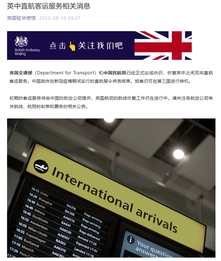 8月10日,英国驻华使馆宣布恢复英中之间双向直航客运服务。中国政府在新冠疫情期间实行的直航禁令将告结束。