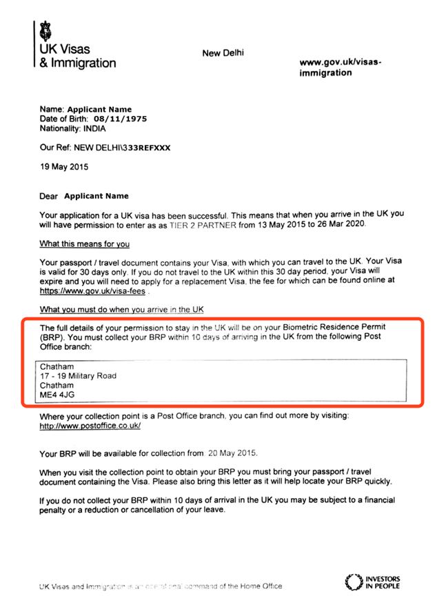 领取BRP时需要带上收到签证时一并拿到的Decision Letter,上面写着领取地址,那么这个Decision Letter长什么样呢?以下就是一张样图,样图中红框内的部分就是同学们来英国后需要领取BRP卡的地址。