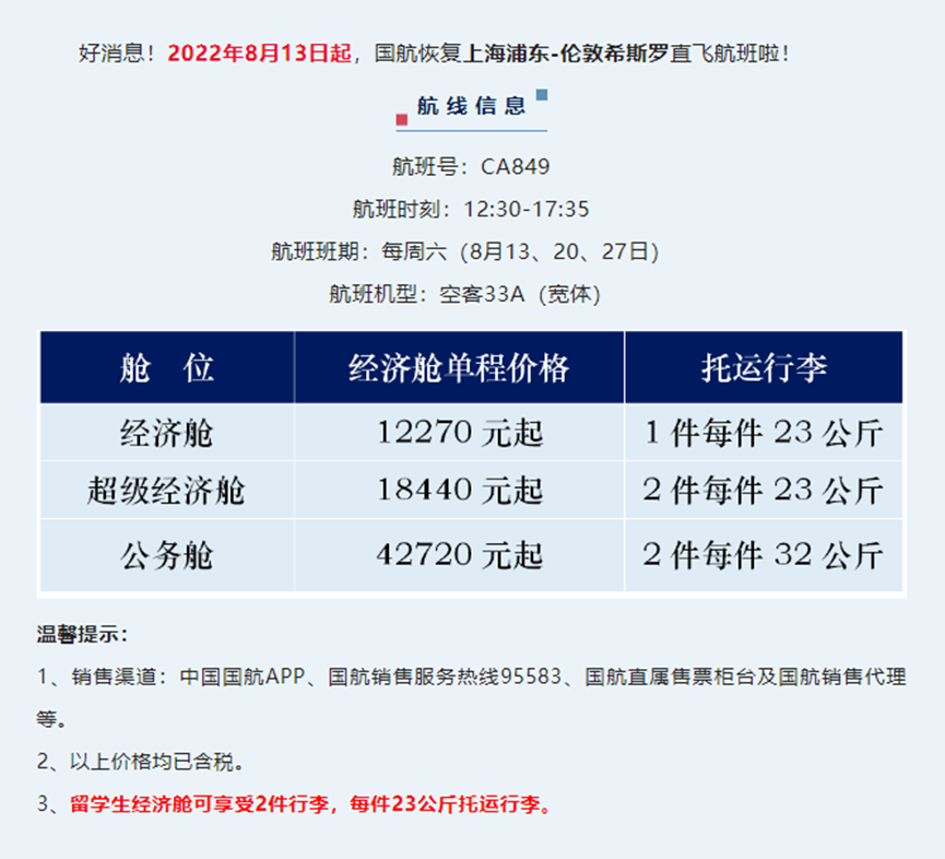 另外,国航也将从8月11日起,恢复北京-伦敦航线,每周四一班。届时,同学们来英国有更多选择啦!