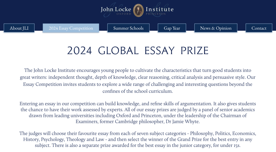 约翰·洛克(John Locke)论文写作竞赛是由位于英国牛津的独立教育组织John Locke Institute与牛津、普林斯顿、布朗等大学教授合作组织的学术写作比赛。每年吸引成千上万的国际高中生参加竞争。
