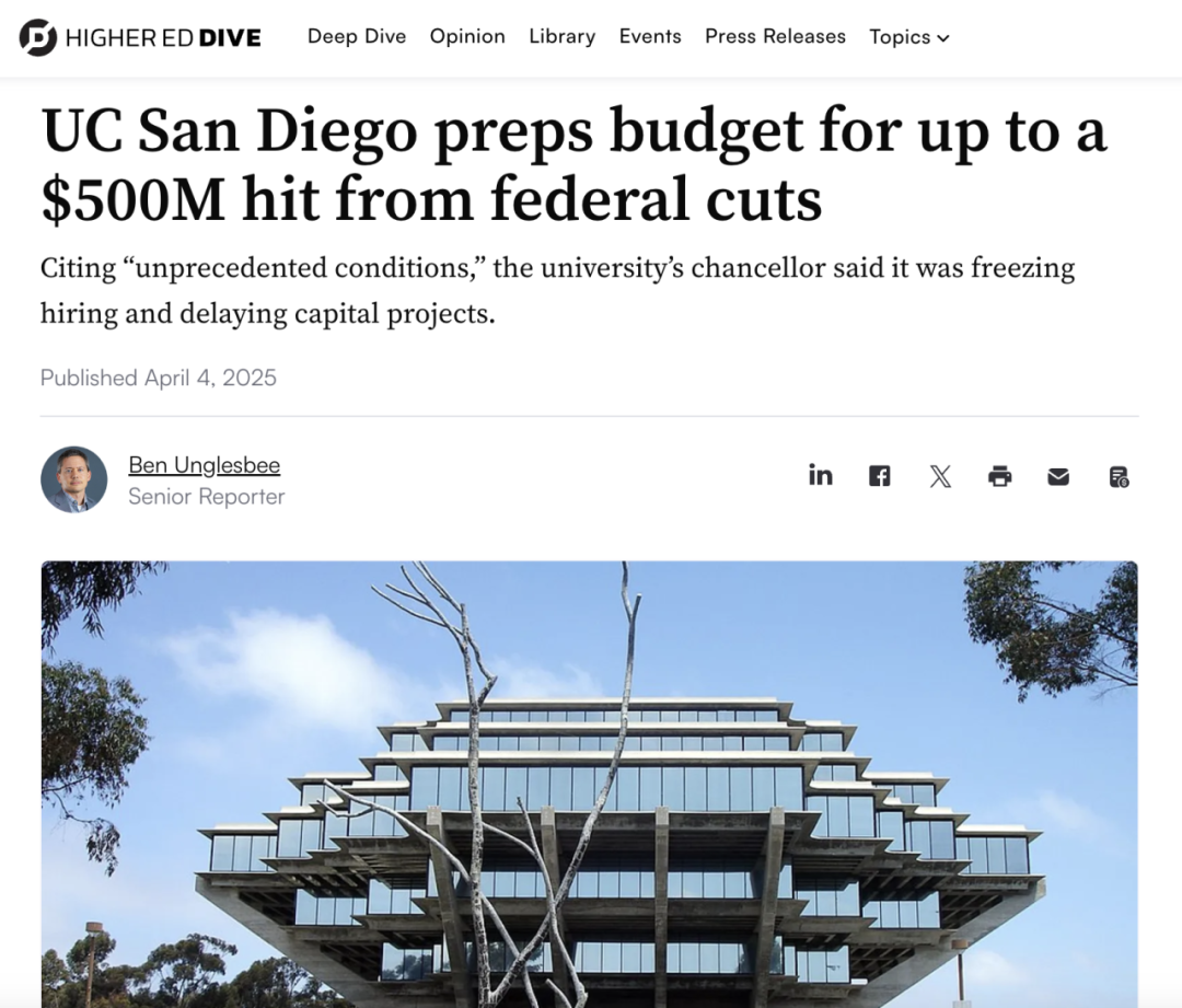 最近,美区留子圈里又炸开了锅。拜一系列联邦拨款削减政策所赐,多所顶尖学府正经历"财政过山车"。在这场风暴中,有的学校选择躺平,而有的学校则选择硬气迎战,除了“领头羊”哈佛大学,还有UC系统的——加州大学圣地亚哥分校(UC San Diego)。