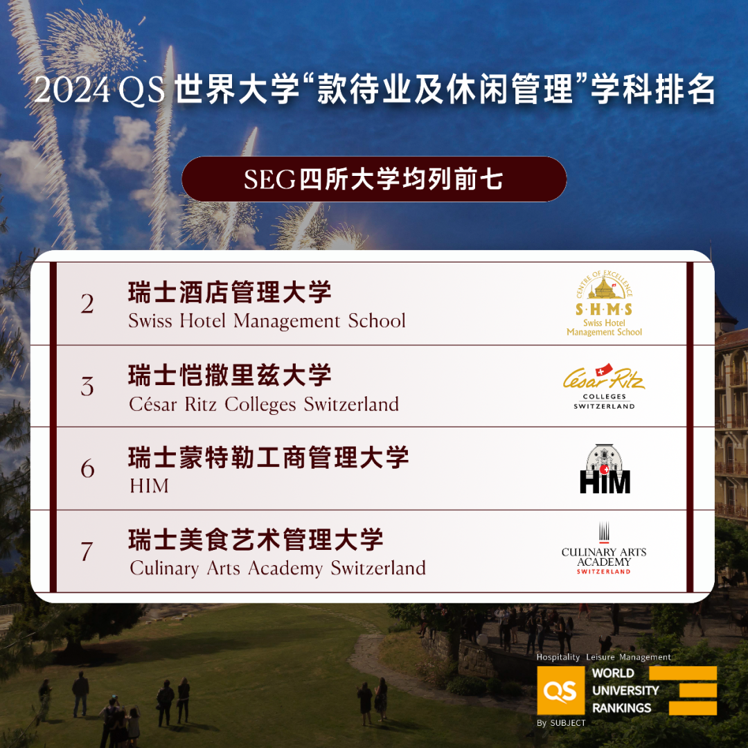 【导读】2024年4月10日,英国国际高等教育组织Quacquarelli Symonds(QS)发布了2024 QS世界大学学科排名。在“款待业及休闲管理”学科排名中,SEG瑞士教育集团旗下的四所大学均列全球前七。