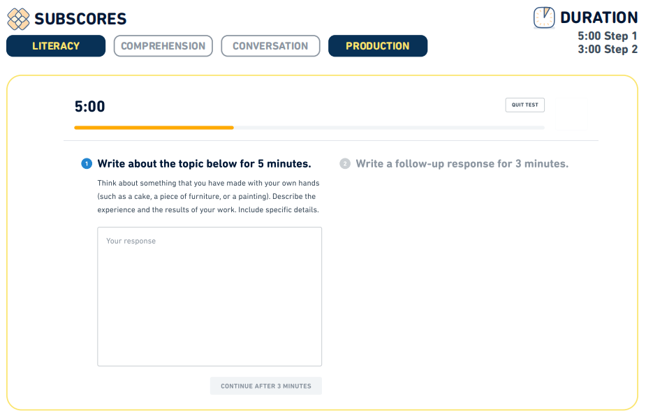 考生在 Interactive Writing 中的表现将影响到多邻国英语测试的总体分数,该部分将计入 Literacy 和 Production 的单项分数。