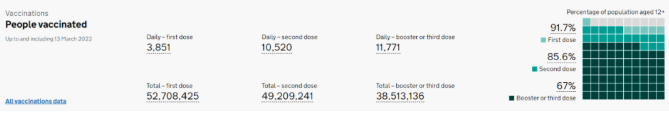 这个政策意味着英国成为全球第一批结束所有的跟新冠有关的国际旅行规则的国家,这对旅客、旅游和航空业来说是一个具有里程碑意义的时刻。公告还称,此举继续推行英国《与新冠共存》战略方案的计划,以及英国疫苗接种和加强剂推广的成功。截止至3月13日,英国已有85.6%的居民接种了2剂疫苗,67%的人口接种了加强剂疫苗。