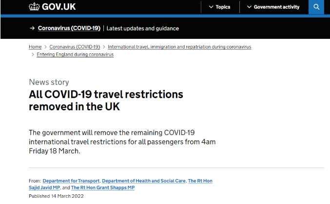 从3月18日凌晨四点开始,所有入境英国的旅客,无论是否接种过新冠疫苗,都不再需要任何形式的新冠病毒检测,入境后也无需隔离,并且不再需要填写旅客定位表,完全恢复到疫情前的开放政策。