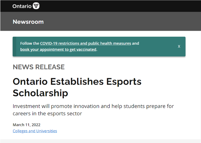 (消息来源:https://news.ontario.ca/en/release/1001754/ontario-establishes-esports-scholarship)