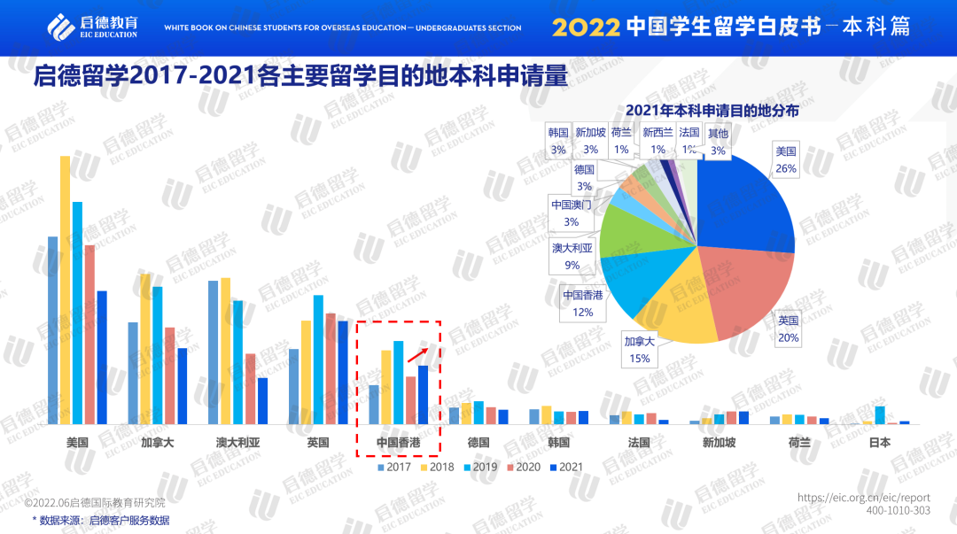 美国国际教育协会(IIE)《Project Atlas,2020》数据显示,热门留学目的地国际学生在读的主要学位是本科/学士学位。启德留学2021年客户服务数据显示,本科求学目的地的分布中,美国(26%)、英国(20%)、加拿大(15%)、中国香港(12%)、澳大利亚(9%)申请占比位于前五位。