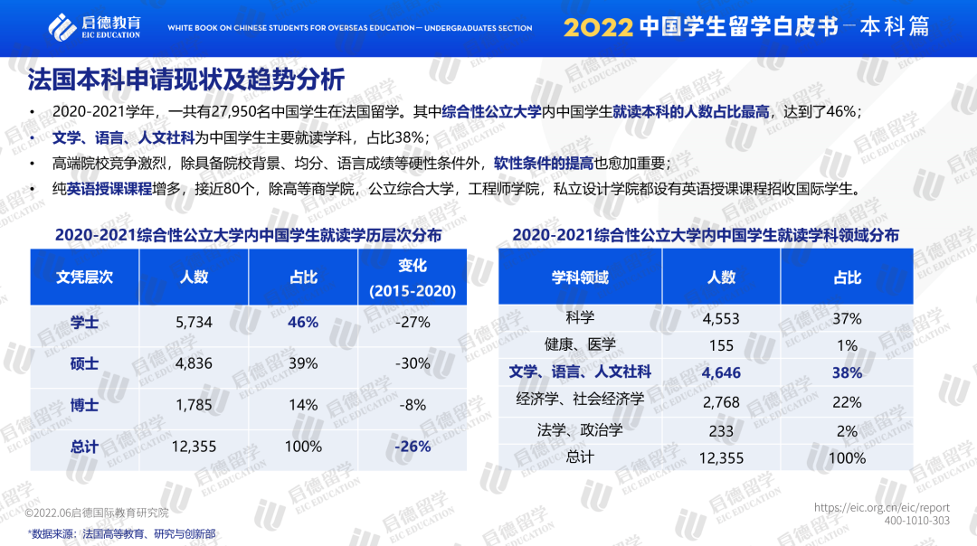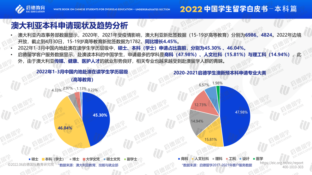 加拿大移民局数据显示,2021年在加拿大的中国内地学生为105,265人,占国际学生总数的16.94%。澳大利亚教育、技能与就业部数据显示,2022年1-3月中国内地赴澳在读学生为132,997人,本科(学士)占比46.04%。