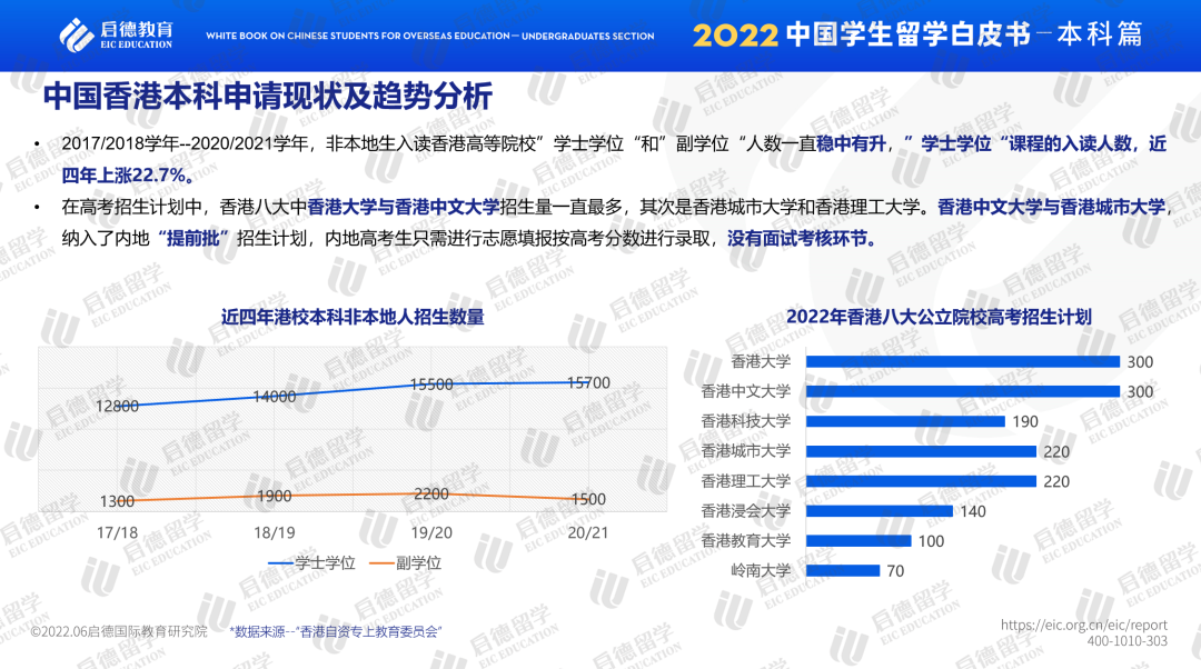 2022年中国香港八大公立院校计划高考招生1540名,香港大学(300)、香港中文大学(300)、香港城市大学(220)、香港理工大学(220)的招生名额较多。2021/2022学年包括澳门大学(561)、澳门科技大学(2455)、澳门城市大学(726)、澳门理工大学(148)、澳门旅游学院(120)、镜湖护理学院(4)在内的六所澳门高等院校,对非本地生的本科招生总计4014人。除高考成绩外,香港与澳门院校也接受内地生以国际课程考试申请报读本科课程。