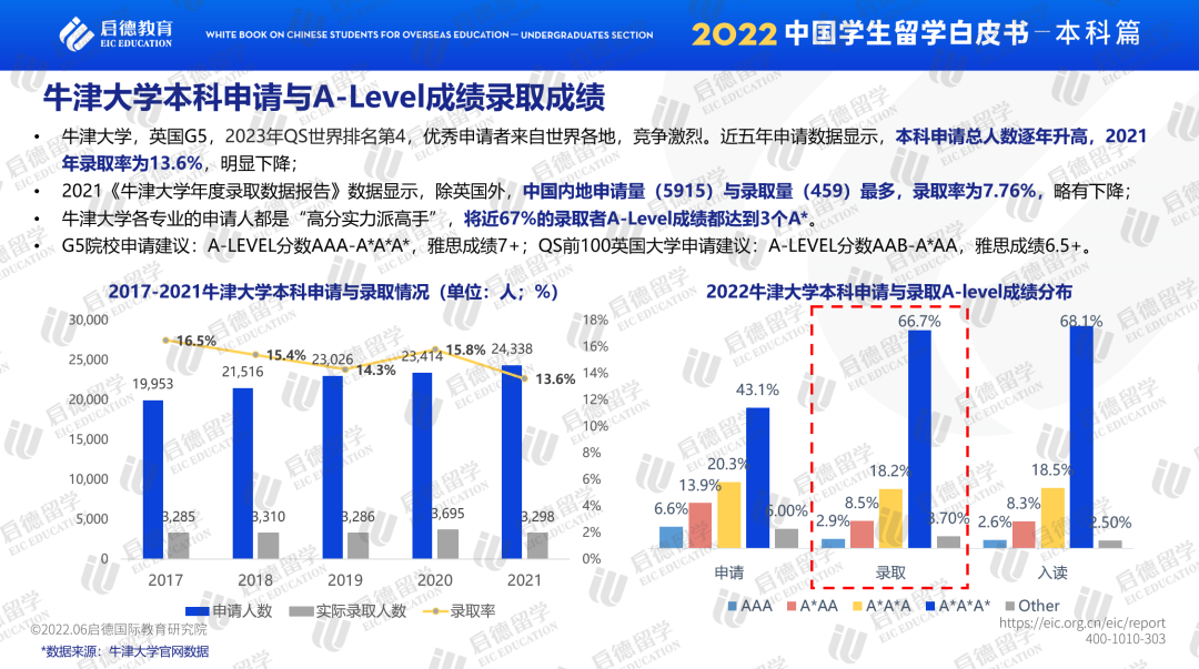 英国UCAS《英国大学2022申请周期数据》显示,中国内地学生的申请人数达到了28,930人,同比增长12%。2021牛津大学官方录取数据显示,除英国外,中国内地申请量(5915)与录取量(459)最多,录取率为7.76%。牛津大学各专业的申请人都是“高分实力派高手”,将近67%的录取者A-Level成绩都达到A* A* A*。