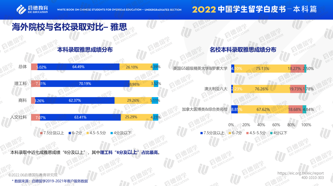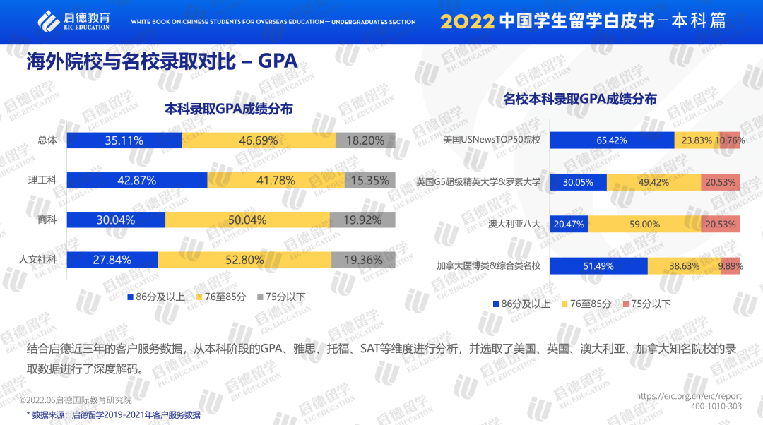 结合启德留学近三年的客户服务数据,启德教育《2022中国学生留学白皮书-本科篇》从本科阶段的GPA、雅思、托福、SAT等维度进行分析,并选取了四大留学目的地:美国、英国、澳大利亚、加拿大知名院校的录取数据进行了深度解码。
