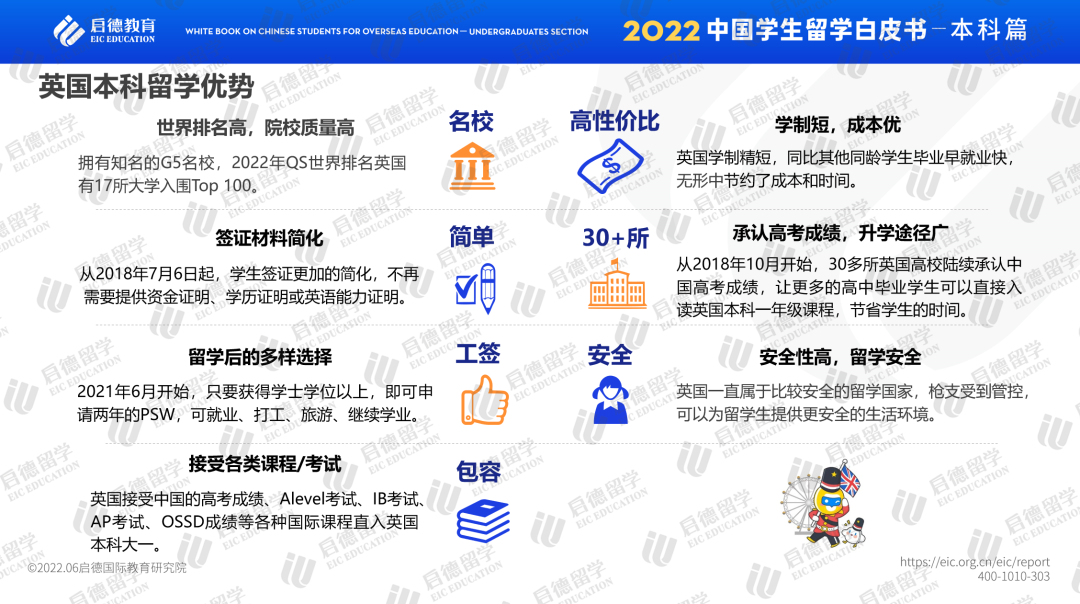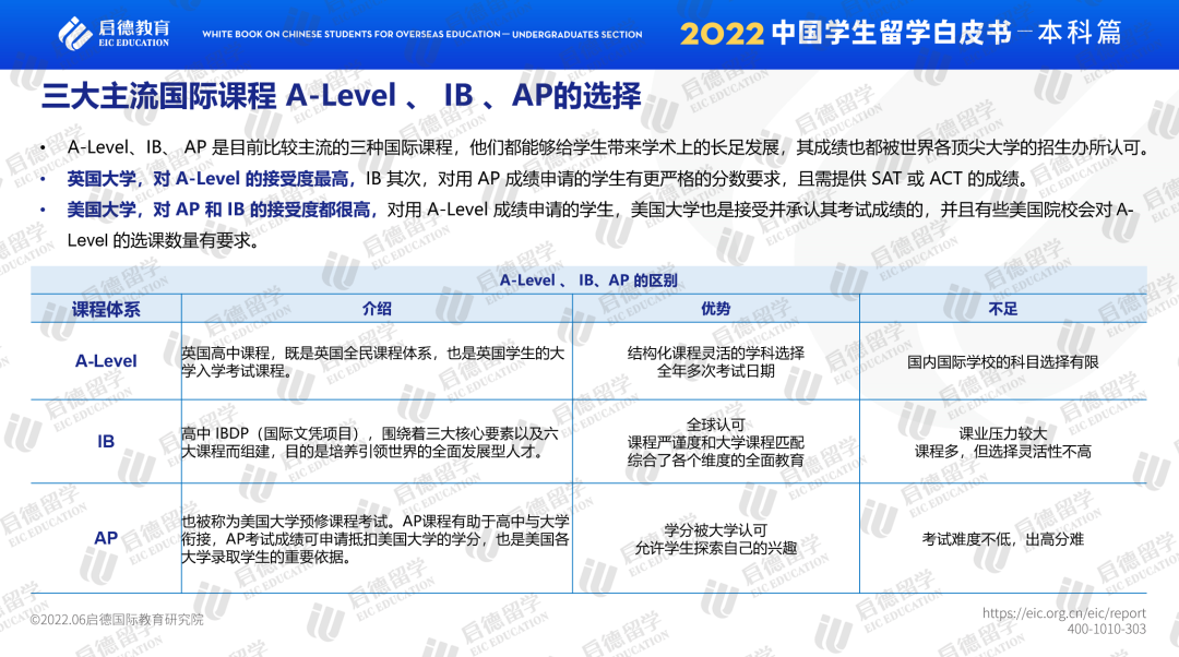 此外,启德教育《2022中国学生留学白皮书-本科篇》还对比了目前比较主流的三种国际课程A-Level、IB、AP。其中,英国大学对A-Level的接受度最高,IB其次,对用AP成绩申请的学生有更严格的分数要求,且需提供SAT或ACT的成绩。美国大学对AP和IB的接受度都很高,也接受用A-Level成绩申请的学生,有些美国院校会对A-Level的选课数量有所要求。