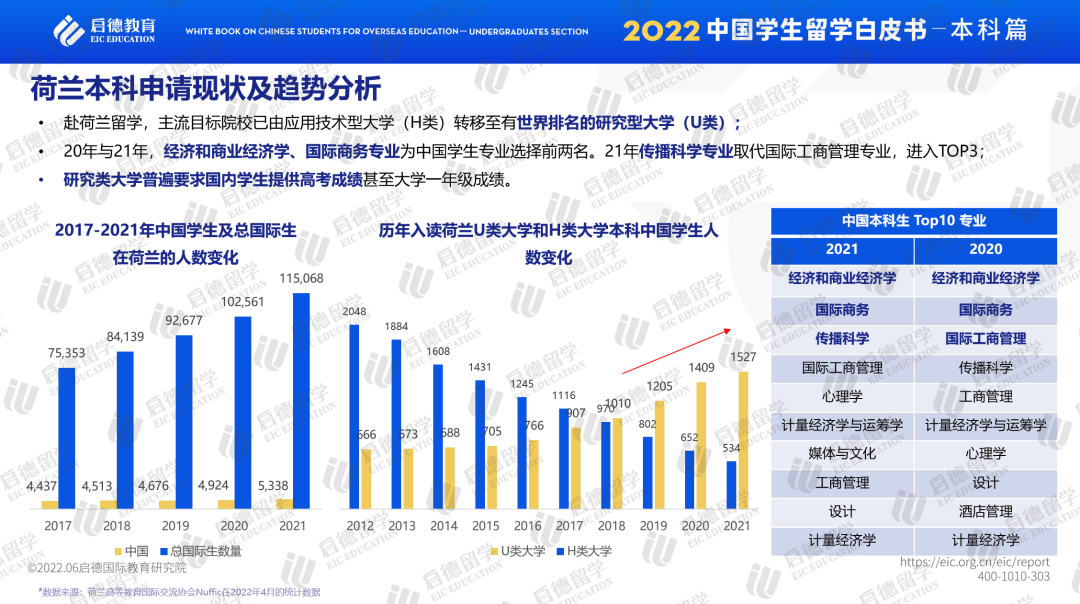 法国高等教育、研究与创新部数据显示,2020-2021学年,一共有27,950名中国学生在法国留学,其中综合性公立大学内中国学生就读本科的人数占比最高(46%)。荷兰高等教育国际交流协会Nuffic数据显示,2021年5,338名中国学生在荷兰留学,荷兰U类大学和H类大学本科的中国学生人数分别为1527人与534人。近十年间,荷兰应用技术型大学(H类)本科的中国学生人数逐年减少,而研究型大学(U类)本科的中国学生呈增长趋势,荷兰U类大学国际排名高,因此较为注重排名的中国学生更愿意申请U类大学。