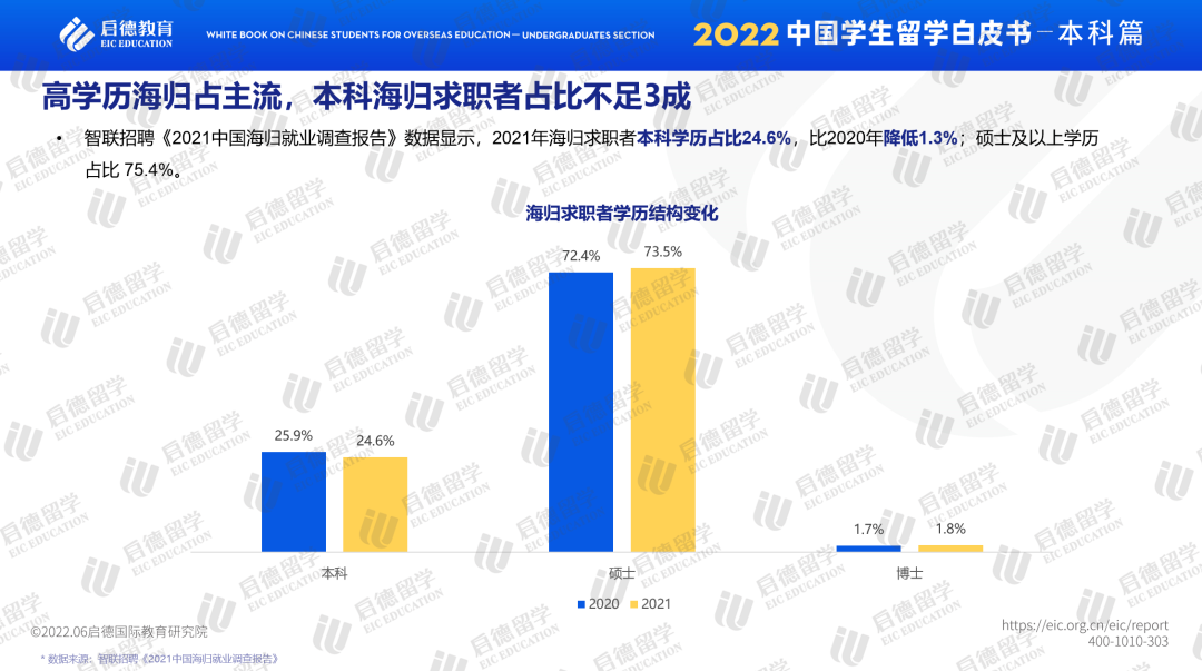 智联招聘《2021中国海归就业调查报告》数据显示,硕士及以上学历海归占主流(75.4%),本科海归求职者占比不足3成。除了回国就业,本科毕业的留学生还可以通过工签获得在海外就业的机会。美国F1学生毕业后有1年的Optional Practical Training时间,简称OPT。普通专业OPT的时限是12个月,STEM(Science,Technology,Engineering,Mathematics)相关专业OPT时限是36个月。如果国际生在OPT的有效期内在美国找到了正式工作,一般都可以顺利申请H1B签证,在美国合法工作。