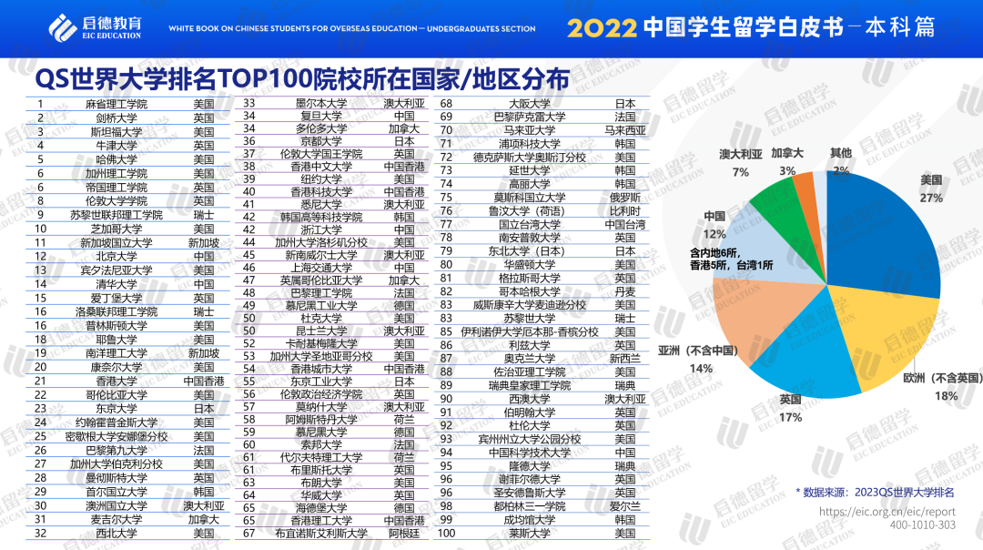 近日,上海推出了“史上最宽松留学生落户政策”:世界排名前50高校的留学生全职在上海工作可以无条件落户,世界排名51-100名的高校留学生全职在上海工作且缴纳社保满6个月后可申办落户。落户系统中世界前100高校排名参照四大排名,即英国泰晤士报高等教育副刊(THE)、美国新闻与世界报道(U.S.News)、QS世界大学排名(QS)、上海软科世界大学学术排名(ARWU)进行认定。以2023QS世界大学排名为例,世界TOP100院校分布于美国(27%),英国(17%),中国(12%,含内地6所、香港5所、台湾1所),澳大利亚(7%)、加拿大(3%)、亚洲(14%,不含中国)、欧洲(18%,不含英国)。