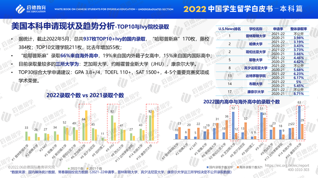 2021美国门户开放报告数据显示,2020-2021学年,中国内地学生在美读本科的人数为125,616人,占各学历层次的39.6%。结合国内媒体统计数据与常春藤院校官方数据的综合统计,截止2022年5月,国内学生共获得937枚“藤校&TOP10”院校的录取,其中“哈耶普斯麻”170枚,藤校384枚,TOP10文理学院211枚。“哈耶普斯麻”录取学生中66%来自海外高中,19%来自国内外籍子女高中,15%来自国内国际高中。