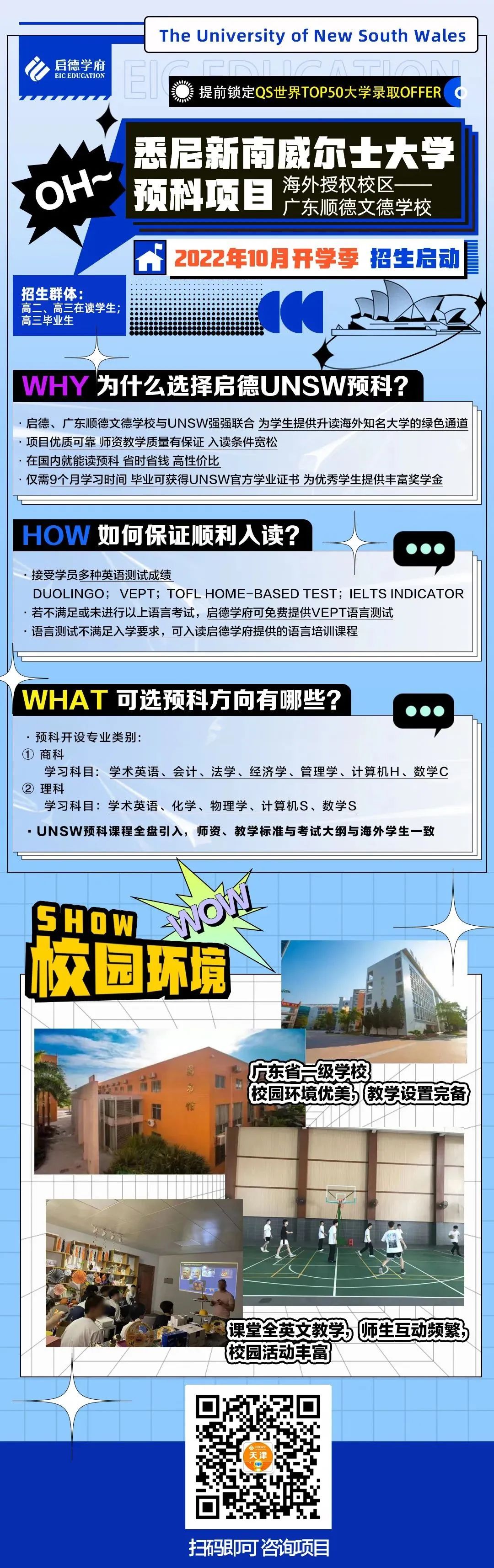 Good luck? ?? 升学选择多样化 高考人数连年攀升,但优质院校的招生人数是有限的。 曾经有数据显示:全国每万名高考考生中,约7个人可以上清北,40个人可以上C9,150个人可以上985,450个人可以上211。 面临这样的情况,越是在象牙塔顶端的学生竞争越是激烈。但同学们不妨打开视野,来解锁更多的升学选择。 Good luck? ?? 澳洲留学真的很香 澳洲作为广受中国学子欢迎的留学目的国,就非常值得被选择。 根据澳大利亚政府统计数据显示,自2015年起中国连续七年成为澳大利亚国际学生最大来源国。 * 数据来源:美国国际教育协会《Project Atlas》 同时澳大利亚也是2022全球最佳留学国TOP1! 而且澳洲洲政府已经宣布,留学生毕业工签延长为3年,相比之前又增加一年。此外,在2022-2023新财年的计划中,189独立技术移民配额增加了1万,直接翻倍至16,652个! 这么友好的移民政策谁听了能不心动呢? Good luck? ?? 该如何选择澳洲院校 之前也给小伙伴们总结过澳洲八大的高考直申要求,大家点击标题就能详细了解: 打开格局,高考后能升读QS TOP50的院校的方式可太多了! 但要和高考生们强调的是,选择直升澳洲八大的同学,一定要有雅思成绩,一般对语言成绩的要求在6.5-7分之间。 那么没有雅思分的同学该怎么办呢? 推荐这部分高考生可以选择启德学府推出的悉尼新南威尔士预科项目。通过就读国内预科的方式,提前锁定个人的本科名校学位! 学员可以通过9个月在国内校园的预科学习,成绩达标就能获得悉尼新南威尔士大学颁发的预科证书及成绩单。而且大家还能凭借悉尼新南威尔士大学预科证明申请其他澳洲或新西兰知名院校,妥妥实现海外名校梦! 新南预科项目另一个优势就是能帮助学员顺利过渡到海外大学的学习课堂中。 项目全盘引进新南威尔士大学预科课程,师资、教学标准及考试大纲与海外学生一致,能帮助学生提前适应和过渡国内外课堂的学习。 不出国门就能完成和海外一样的预科学习,期间节省了学生大量的时间和费用,性价比超高! 现在可能很多小伙伴心动了,目前新南预科项目10月开学季正在火热招生中,给自己未来上一道保险的机会就在眼前,你还不准备立刻行动吗? 有关于【新南威尔士大学预科项目】的问题 请添加启德官方小助手咨询