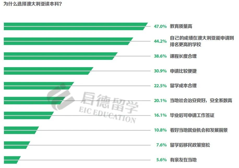 但是高中生升学,不要只盯着国内一条赛道哦,不妨放眼全球,作为主要热门留学国家的澳洲一直以来都是本科留学目的地的优选之一。根据启德教育自有调研数据,排名前四位的赴澳读本科的原因分别为“教育质量”、"自己的成绩在澳大利亚能申请到排名更高的学校”、“课程长度合理”、“申请比较便捷”。